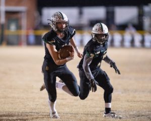 Bandys High quarterback Lake Hojnacki, who gained 55 yards on 11 carries and scored four rushing TDs on Friday night, heads upfield with Elijah Clarke (7) ready to block against West Stokes./MICHELLE THOMPSON PHOTO