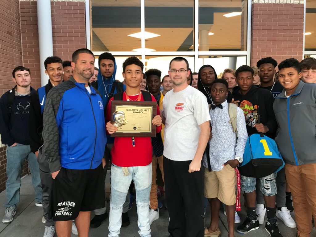 Maiden’s Caleb McDaniel (center) with his WNNC 101.3 FM Golden Helmet Award for Week 11 of the high school football season. He’s with Blue Devils head coach Will Byrne (left), WNNC’s Josh Edmondson (right) and some of his Maiden teammates./WNNC PHOTO